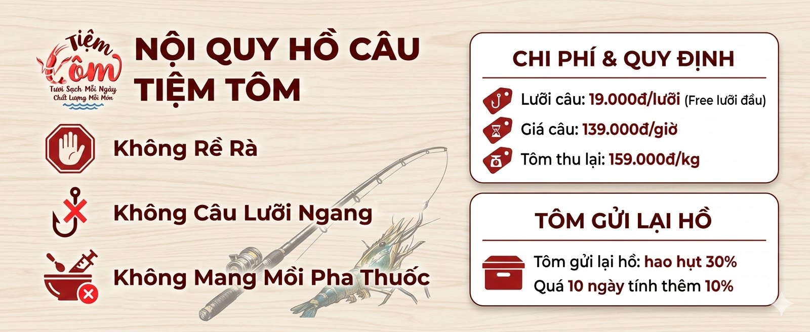 Để đảm bảo trải nghiệm vui vẻ và công bằng cho tất cả khách hàng, Tiệm Tôm có một số quy định cơ bản khi tham gia câu tôm. Nhân viên sẽ hướng dẫn tận tình cho khách mới, từ cách thả mồi, canh phao đến cách xử lý khi tôm cắn câu. Dù là lần đầu trải nghiệm, khách vẫn có thể dễ dàng tham gia và tận hưởng trọn vẹn niềm vui